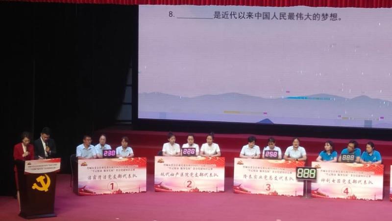 不忘初心跟黨走,牢記使命譜華章!為了慶祝中國共產(chǎn)黨成立99周年,6月28日下午,晉城市非公企業(yè)黨委在澤州天泰錦辰煤業(yè)有限公司職工文化宮進(jìn)行了一場別開生面的“牢記使命 服務(wù)發(fā)展”黨建知識競賽。潔霸清潔黨支部、現(xiàn)代婦產(chǎn)醫(yī)院黨支部、隆泰實(shí)業(yè)黨總支、神利電器黨支部、眾宸工貿(mào)黨支部和蔬菜公司黨支部等六支代表隊(duì)在此激戰(zhàn)正酣,各代表隊(duì)你追我趕,斗志昂揚(yáng),不甘落后,力爭上游,最終,我公司支部代表隊(duì)榮獲比賽三等獎。
