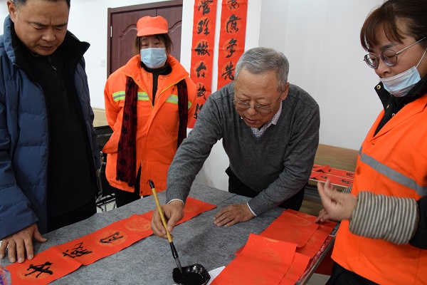 現(xiàn)場人頭攢動,熱鬧非凡,處處洋溢著歡樂喜慶的氣氛。賈大一老師剛執(zhí)墨筆,就吸引了現(xiàn)場數(shù)十名員工駐足觀賞。他的書法如行云流水,一副寓意著對新年美好祝福的春聯(lián)便一氣呵成。各位老師揮毫潑墨,一幅幅散發(fā)著清新墨香的春聯(lián)展現(xiàn)在大家面前!懊坊í劇鲍@得者張保平老師現(xiàn)場演唱上黨梆子戲曲名段,字正腔圓,渾厚豪邁,把活動推向了高潮。市總工會副主席韓敦峰為員工分發(fā)了對聯(lián)和防疫口罩。