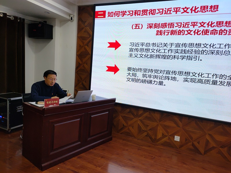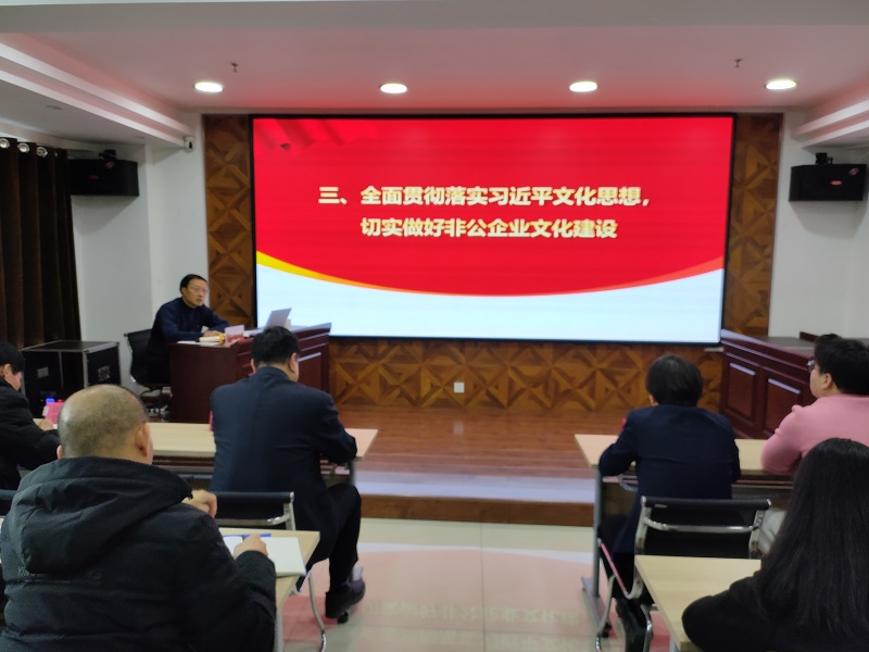 郝天順從習近平總書記對宣傳思想文化工作作出的重要指示談起,從“如何認識和理解習近平文化思想 ”“如何學(xué)習和貫徹習近平文化思想”“全面貫徹落實習近平文化思想,切實做好非公企業(yè)文化建設(shè)”三個方面進行了深刻闡述,指出習近平文化思想既有文化理論觀點上的創(chuàng)新和突破,又有文化工作布局上的部署要求,明體達用、體用貫通,明確了新時代文化建設(shè)的路線圖和任務(wù)書,在我國社會主義文化建設(shè)中展現(xiàn)出了強大偉力,為做好新時代新征程宣傳思想文化工作、擔負起新的文化使命提供了強大思想武器和科學(xué)行動指南,并結(jié)合非公企業(yè)實際,要求要緊緊圍繞學(xué)習貫徹習近平文化思想,圍繞貫徹黨的二十大關(guān)于文化建設(shè)的戰(zhàn)略部署,強化黨建引領(lǐng)作用,帶動企業(yè)文化發(fā)展,將文化建設(shè)作為企業(yè)戰(zhàn)略,不斷創(chuàng)新文化理念,將企業(yè)文化實體化、制度化,促進企業(yè)文化升華,推動各項工作落地見效。